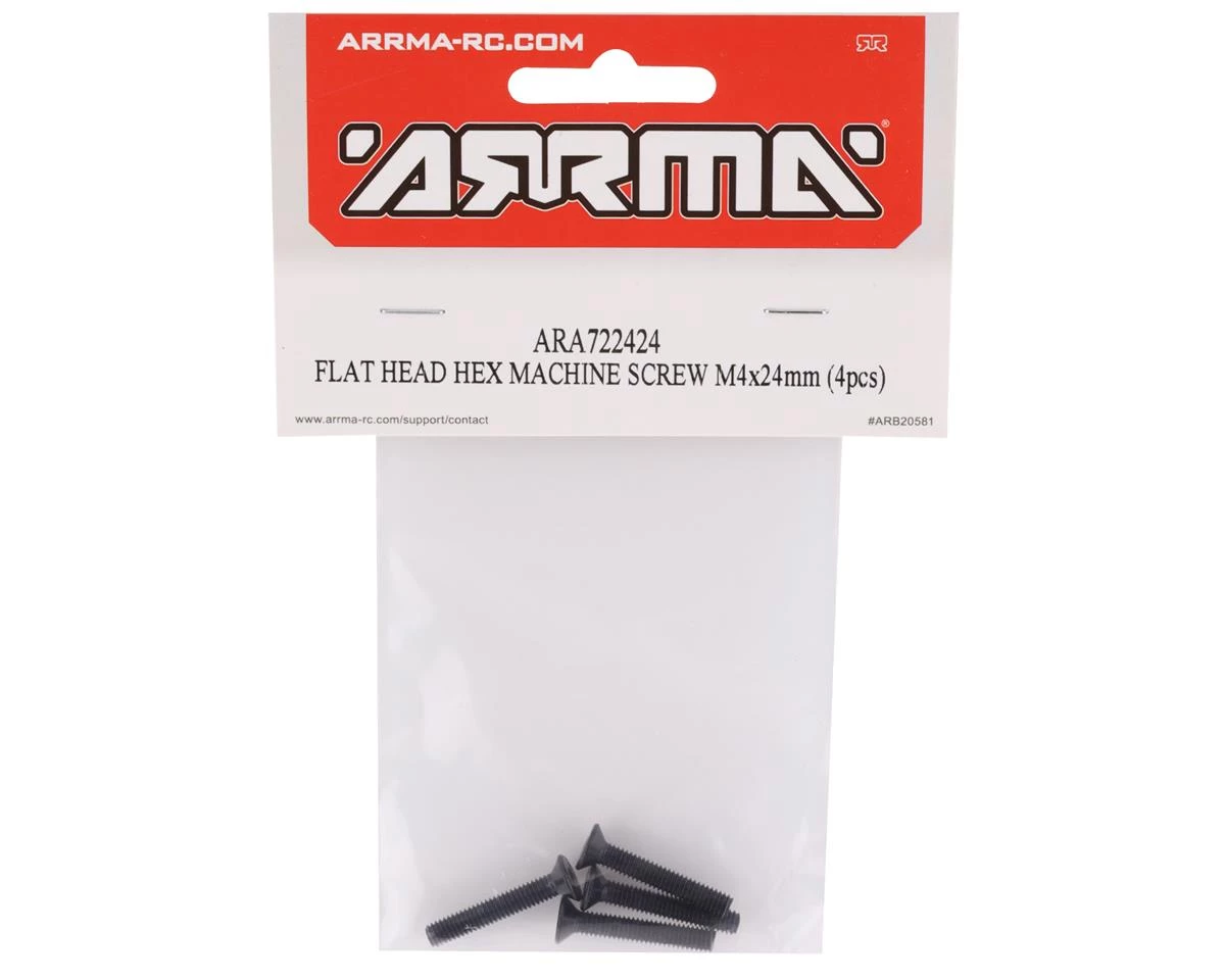Arrma 4x24mm Flat Head Screws. These replacement screws are intended for the Arrma Vendetta 3S BLX. Package includes four flat head screws.