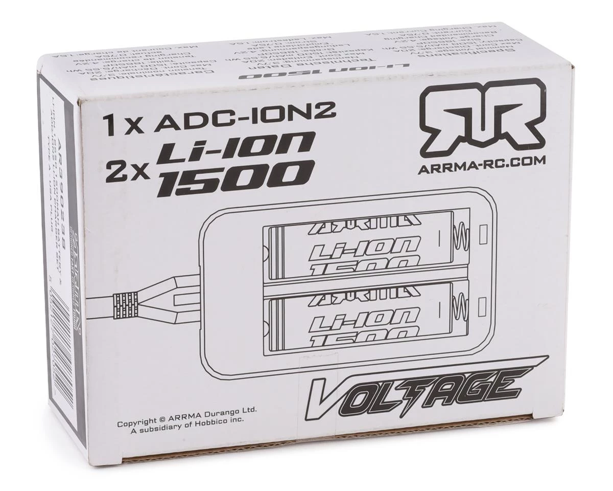 Arrma ADC-L2 Li-Ion Charger with Two Li-Ion 18650 Batteries. This set comes with two batteries and a charger intended for the Arrma Fazon Voltage.