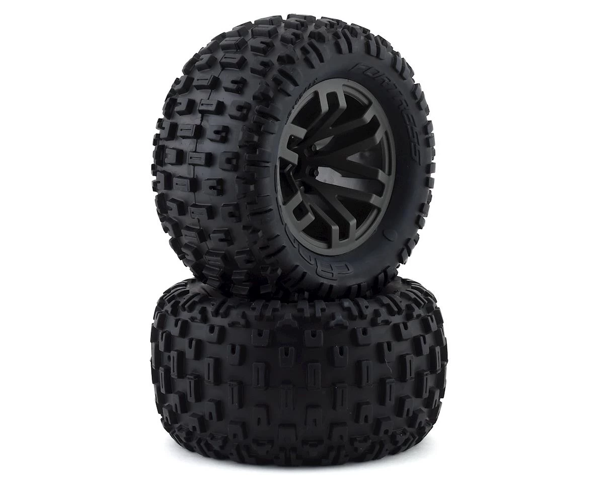 This is a replacement set of Arrma Dboots ‘Fortress MT’ Tire Set, Premounted on Gun Metal Arrma wheels. These high-quality dBoots Fortress MT tires, mounted on ARRMA wheels, are direct replacements for your kit items