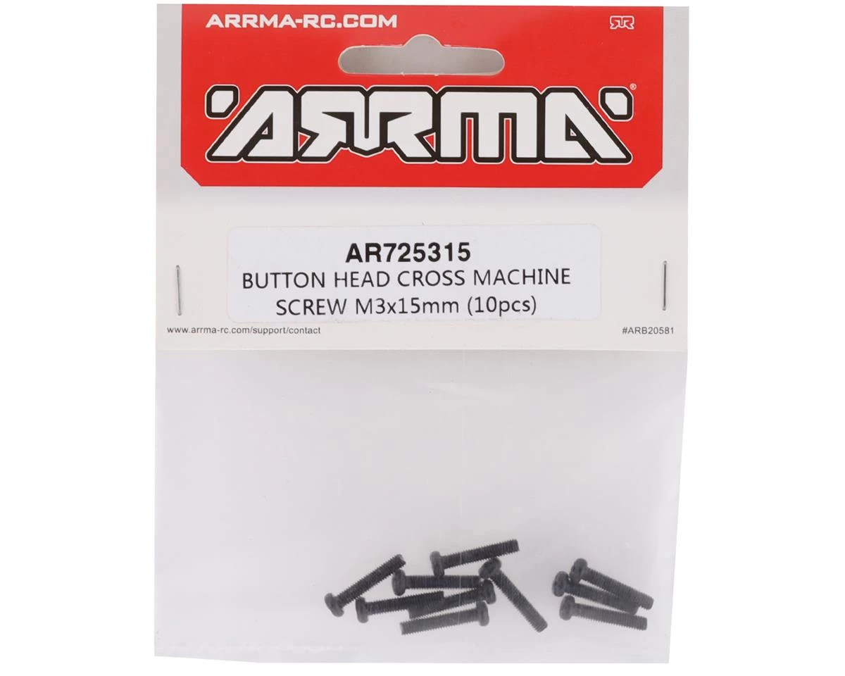 This is a replacement pack of ten Arrma 3x15mm Button Head Cross Machine Screw, high-quality Button Head Cross Drive Machine Screws that are the perfect items when servicing your ARRMA vehicle.