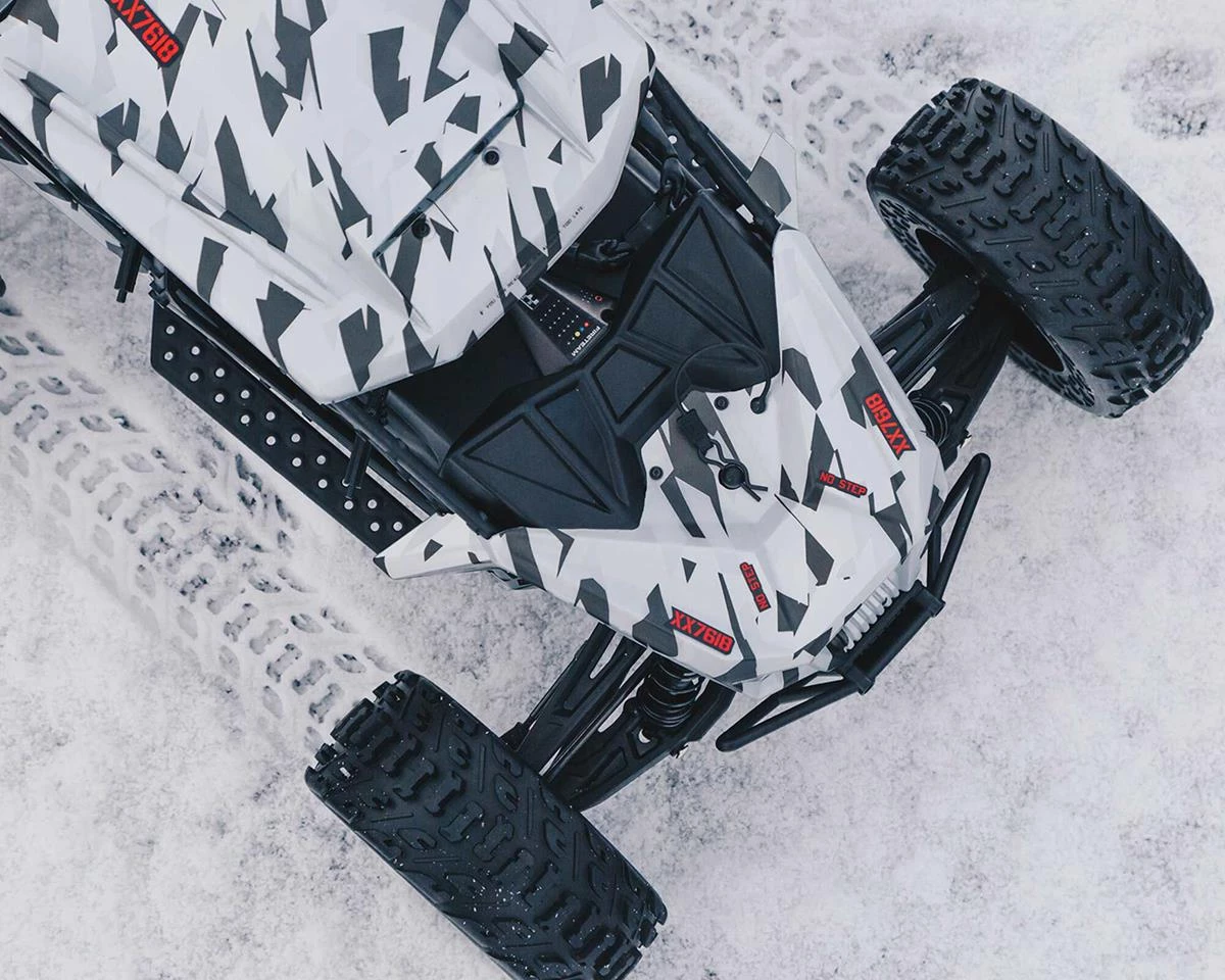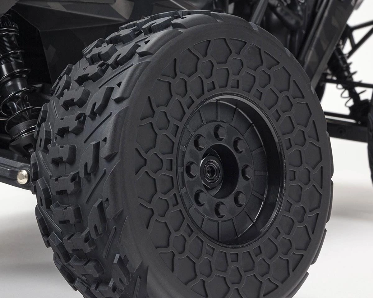 The aggressive multi-panel body is inspired by military “fast attack” style vehicles used by military and private contractors around the world. The body comes factory-finished in either matte black or matte white camouflage, and features full roll cage beneath to add to the military feel and toughness. The detailed interior carries a four-man crew and is perfect for further personal customization. A special multi-terrain dBoots FIRETEAM wheel and tire combo finishes off the look, while providing drivers with high traction and smooth travel over rough off-road tracks. But once you dig in beneath the impressive body, you see why this model is so unique.