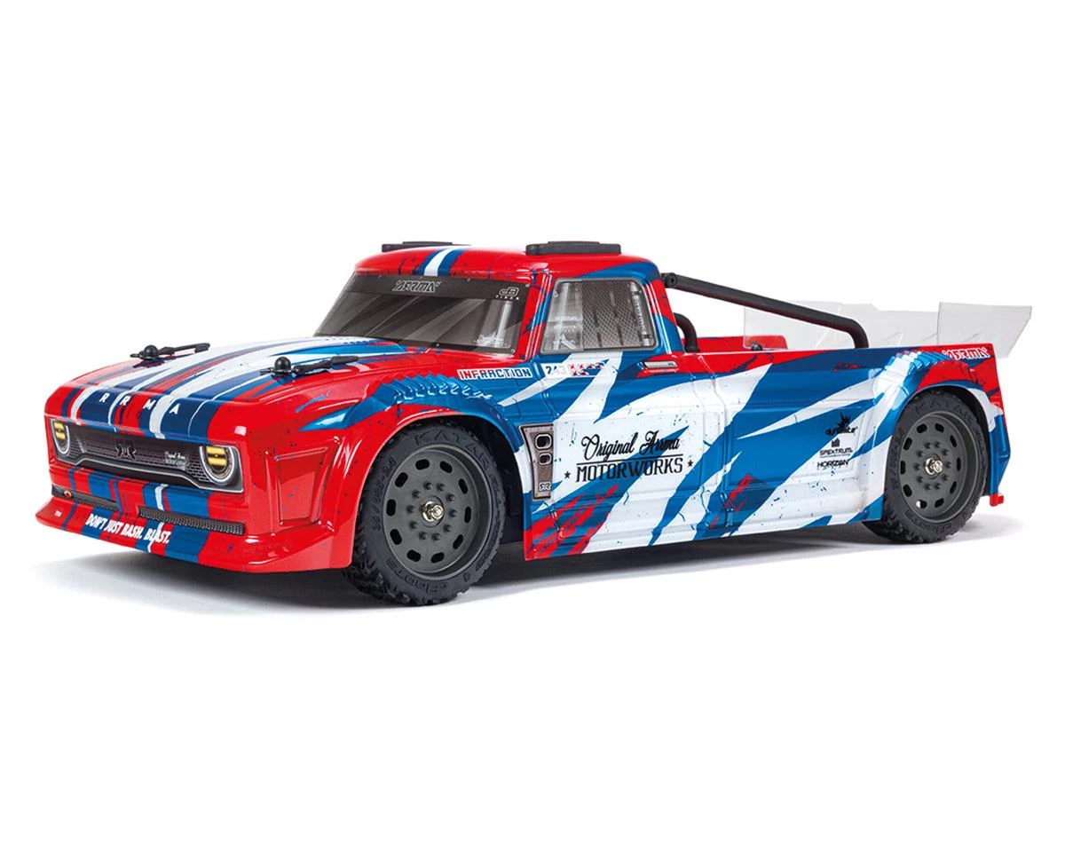 This Infraction 4X4 Mega incorporates the signature Arrma easy-access modular design. This allows for easy removal of the power system, electronics, and differential components making routine maintenance fast and simple. Placed on top of this extremely versatile chassis is a stunning truck body that has been painted with a red, white and blue paint job. The body incorporates roof skids to help keep the body safe in case of a rollover. All of these features and functions allow for a great driving experience.