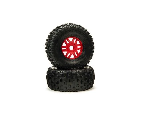 This is a Arrma dBoots ‘Fortress’ Pre-Mounted Tire Set, intended for use with the Mojave BLX kits and pre-mounted on red split-spoke Arrma wheels and are ideal replacements for your kit items.