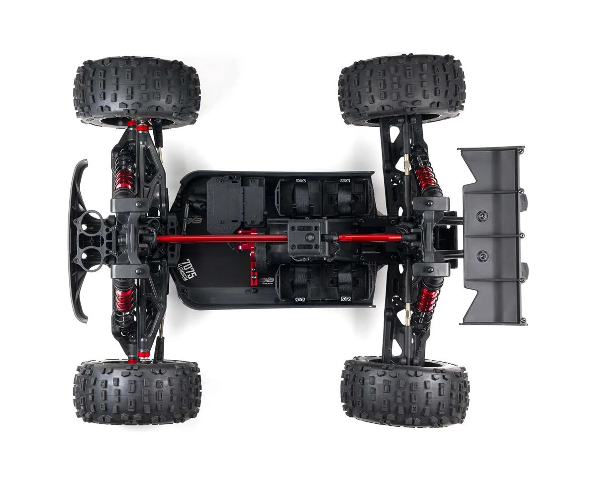A center body support, aluminum center braces and composite chassis side pods add more strength. All-metal diff outdrives and gearbox internals, plus durable steel driveshafts, provide a reliable, heavy-duty drivetrain that holds up to demanding stunts and brutal terrain.
