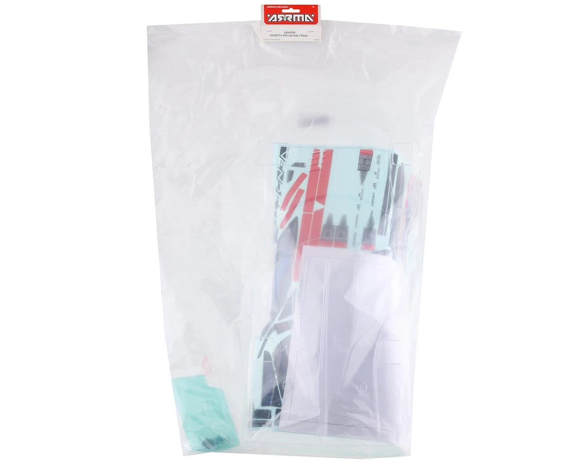 Arrma Vendetta 3S BLX Body. This clear body is a great option allowing you to create a custom paint scheme for your Arrma Vendetta 3S BLX. Made from durable polycarbonate, this body comes pre-cut with body holes drilled for ease of use. Package includes one complete body set with decals and hardware.